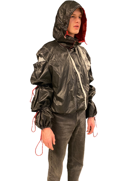 the Sustainable element - the jacket is made from a repurposed old parachute.